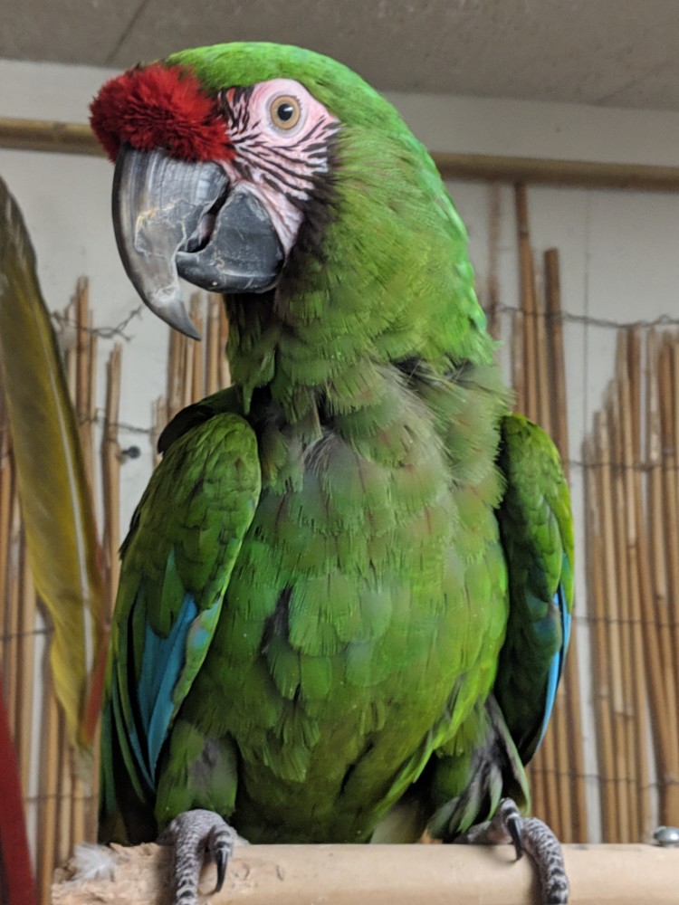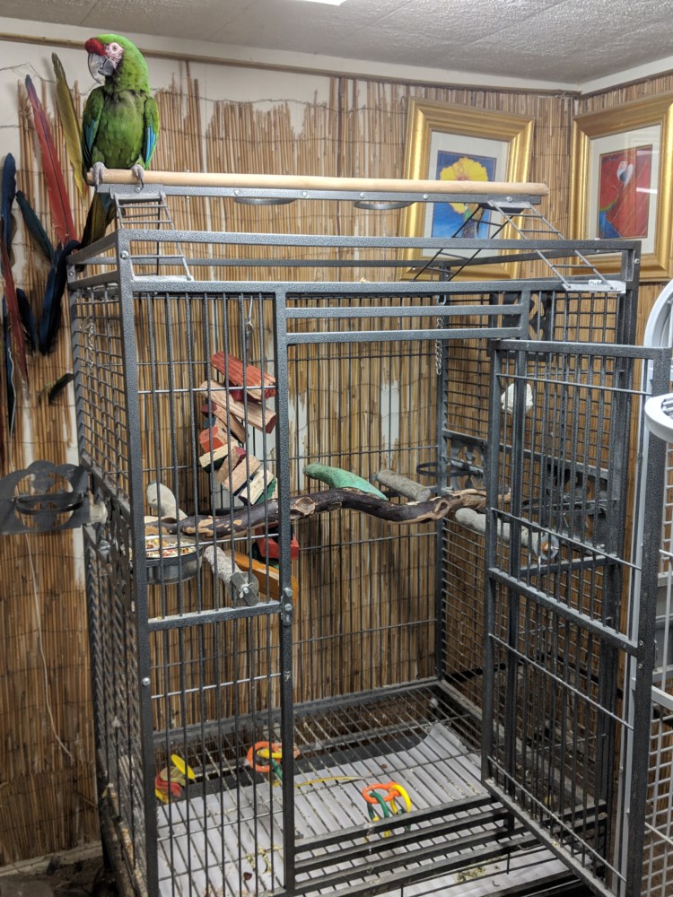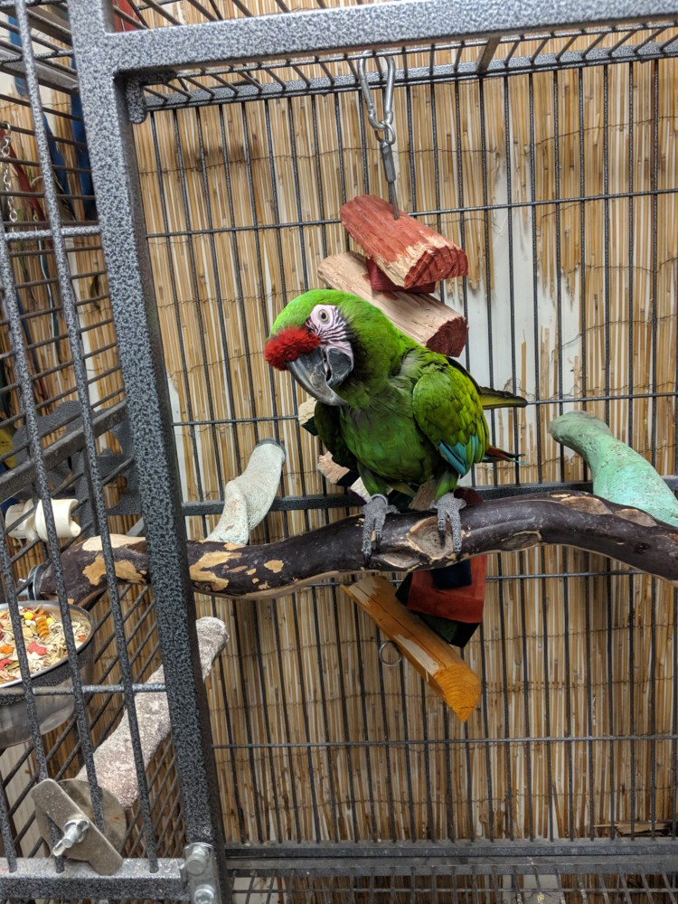 We discovered that Buddy, is one Very sweet Military Macaw. For the last 9 years, he was a cage companion of Amelia, an 11 year old Female Greenwing Macaw, and they have been together for the past 10 years. We noticed that when they were housed in the same cage, they jousted a lot. Amelia, is the instigator of the two, and dominant over Buddy. Grabbing treats, and being aggressive when their veggies were served.