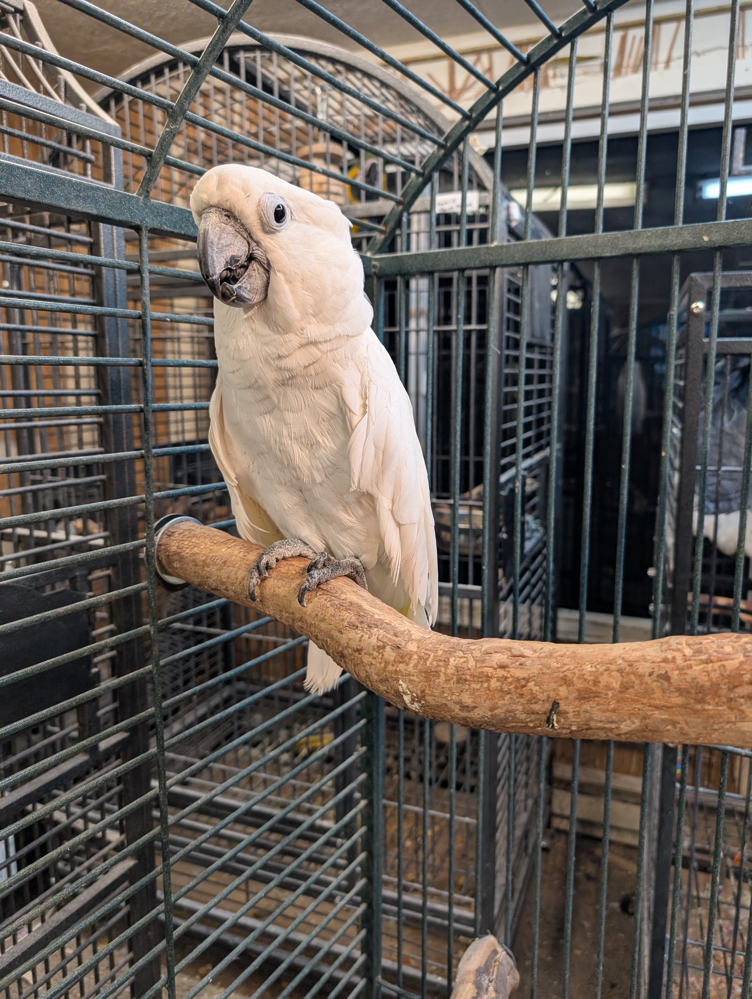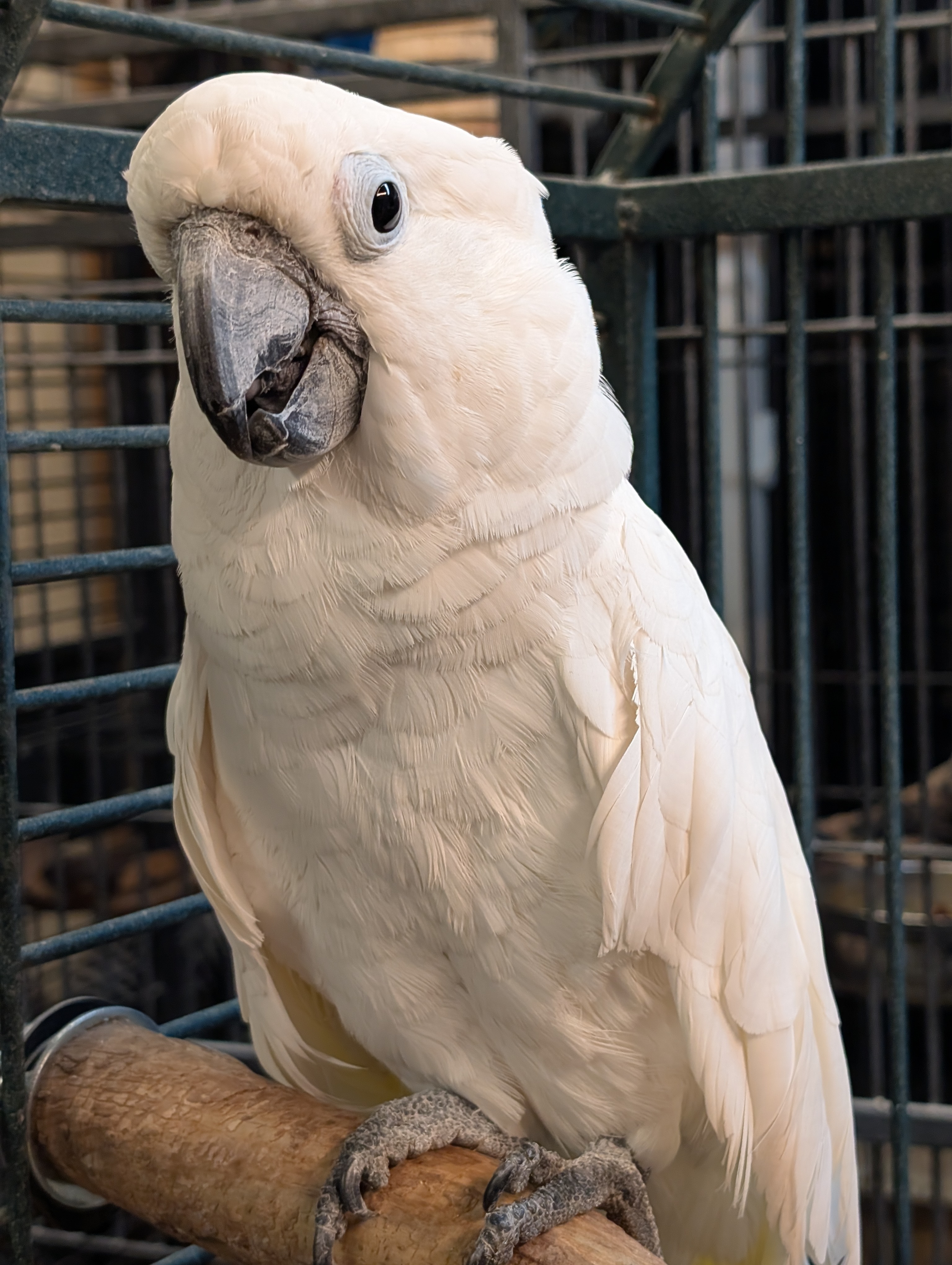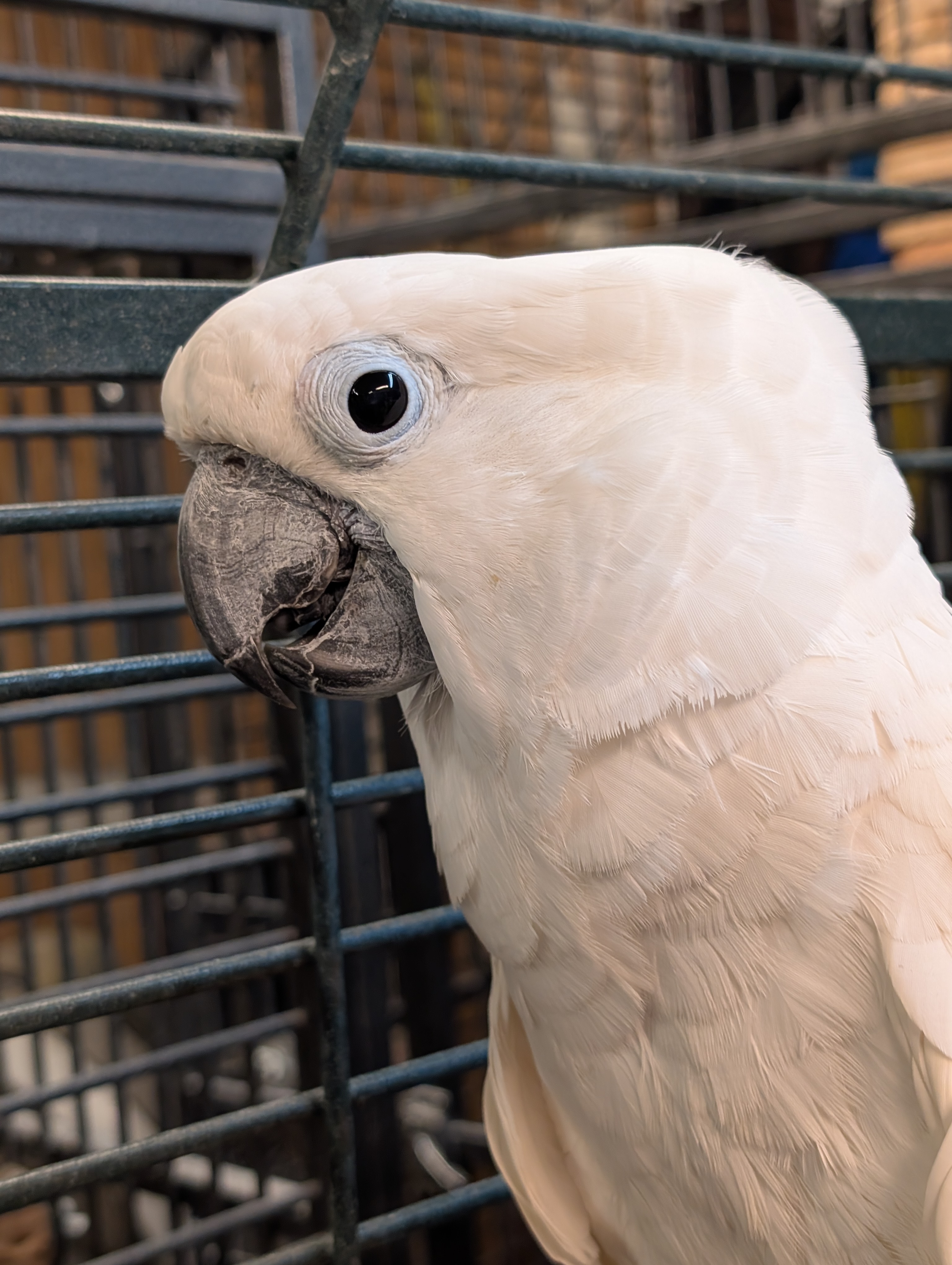 Fagen is a truly special 30-year-old male Umbrella Cockatoo who is very cuddly and has a warm, gentle personality.