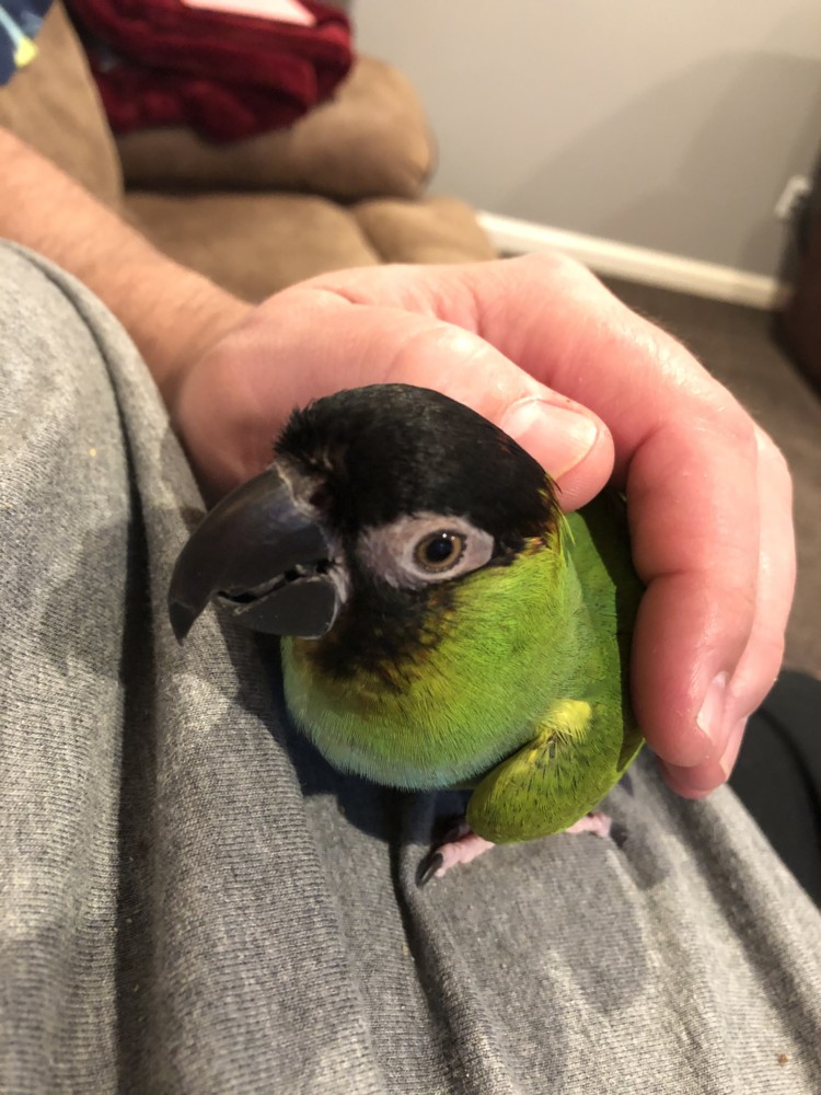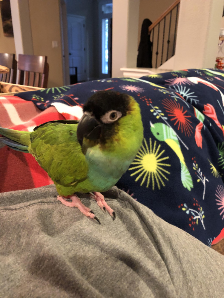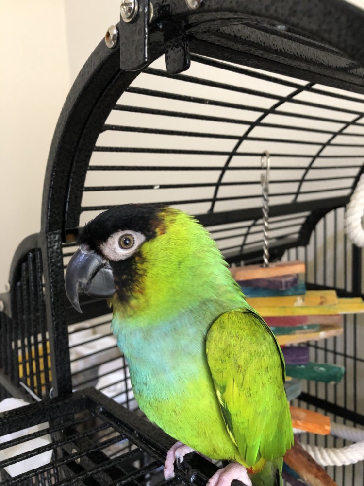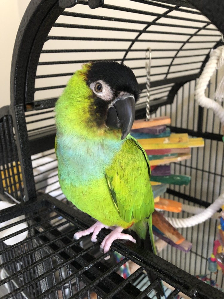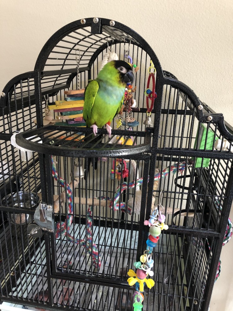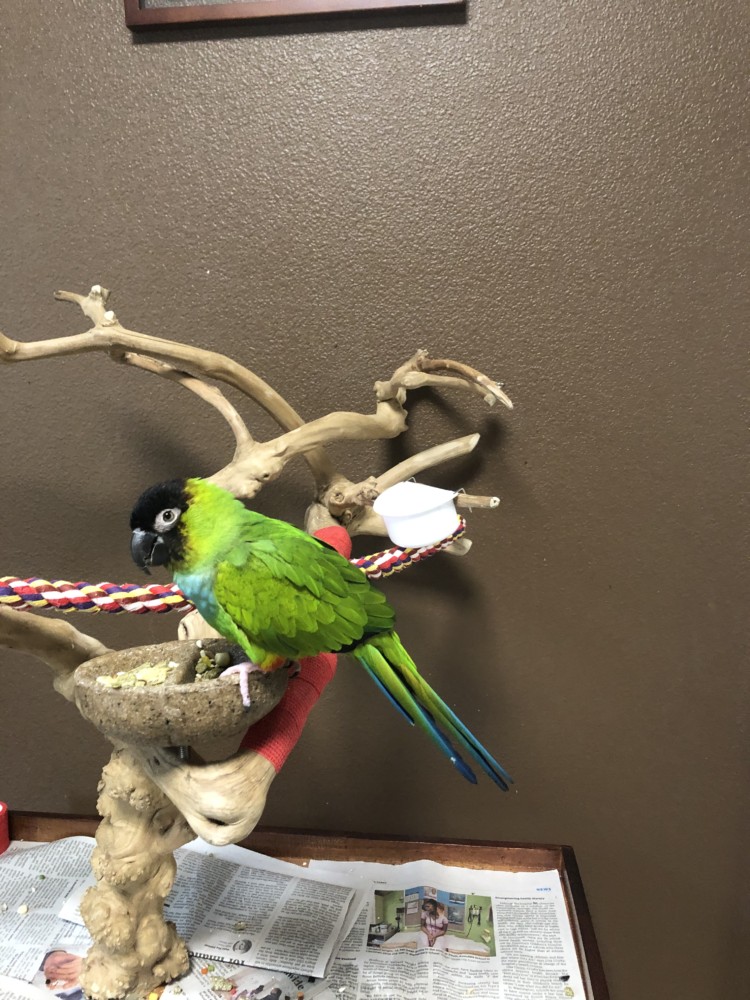 Larry is a wonderful tame and mature 23 year old male Nandy Conure. Larry loves all adults, and will never trust children. Larry is very cuddly and sweet, and he’s loves to perch on your shoulder OR LAP. Larry now has a new floor cage with a pop open top. A playpen/ Tree is available for a small additional fee.
