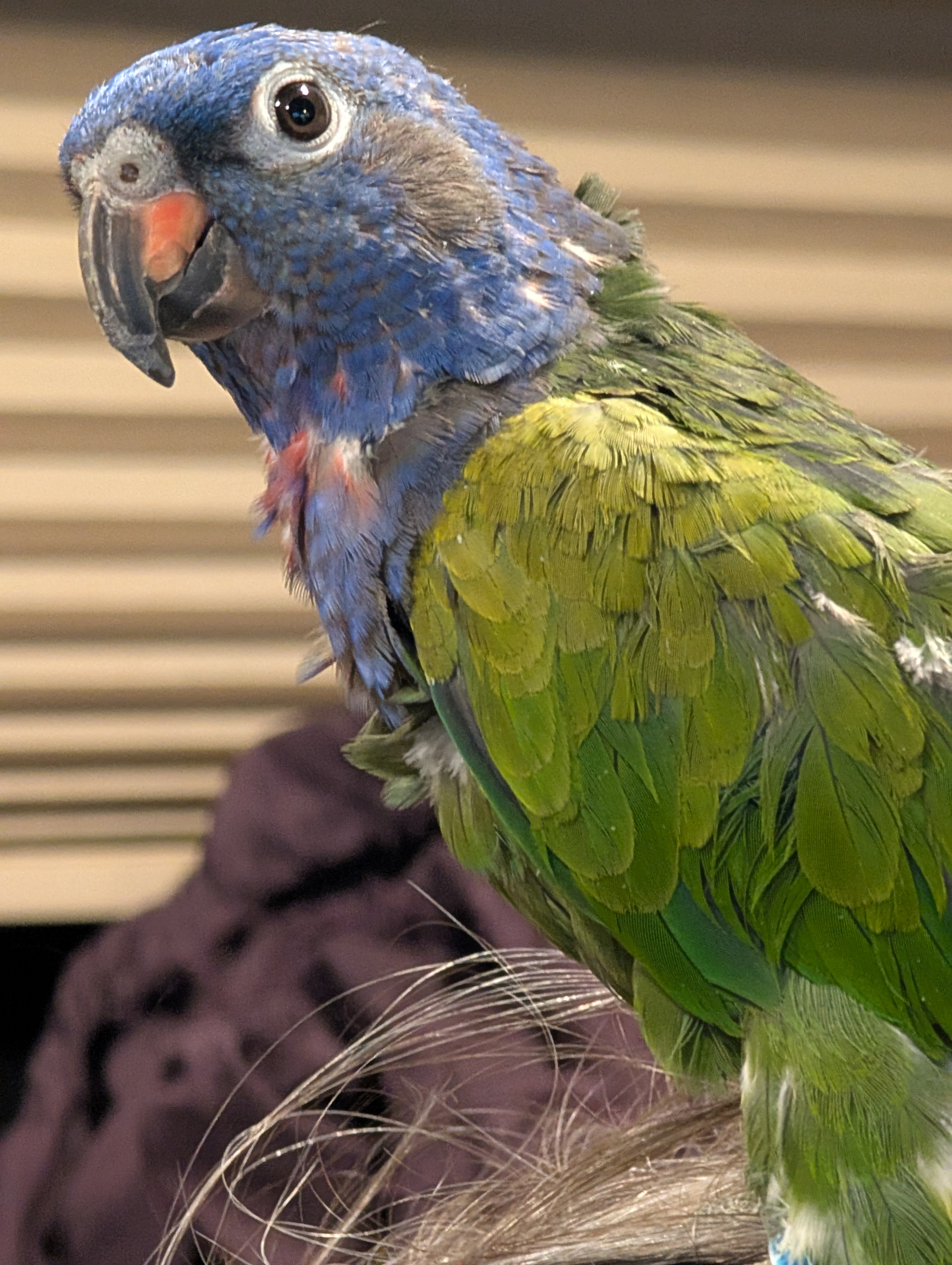 Piona is a very calm and sweet Blue-crowned Pionus with a gentle demeanor.