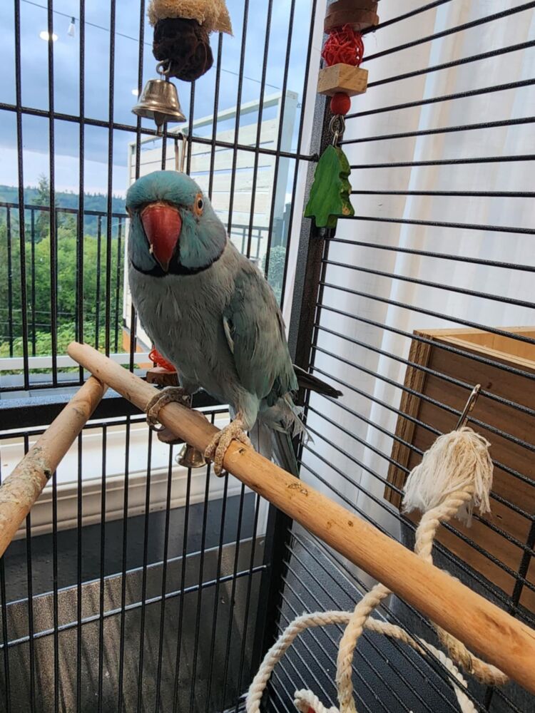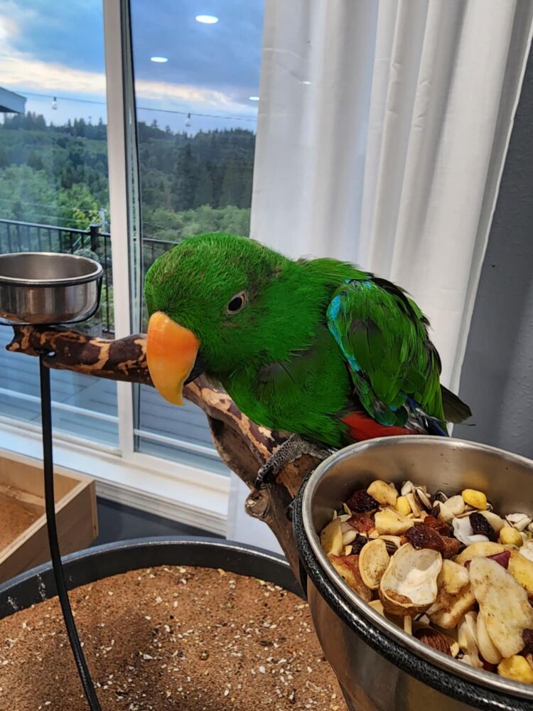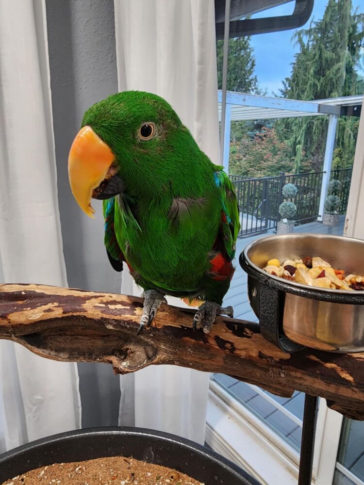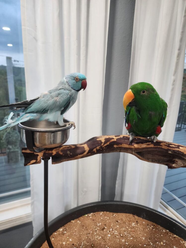 Reggie is a tame, 20-year-old male Eclectus who is bonded to his best friend, Boris, a 25-year-old male Indian Ringneck. Boris is also hand-tame and fully flighted.