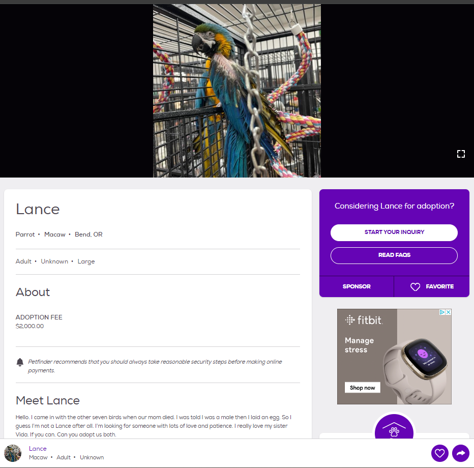 If you have at least 1 years’ experience with macaws, and are a homeowner, and are ready to adopt Rhu within the next few days.