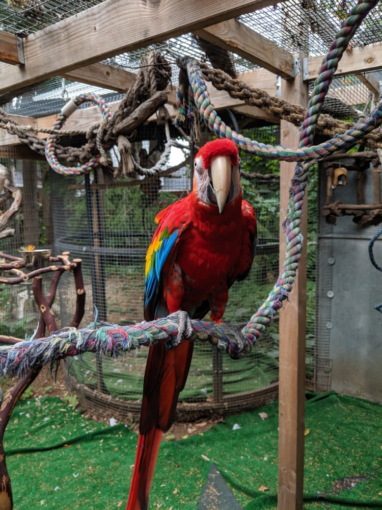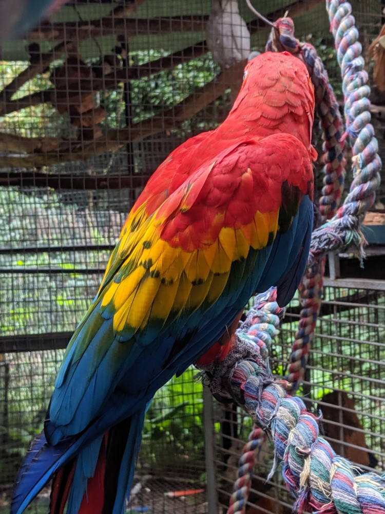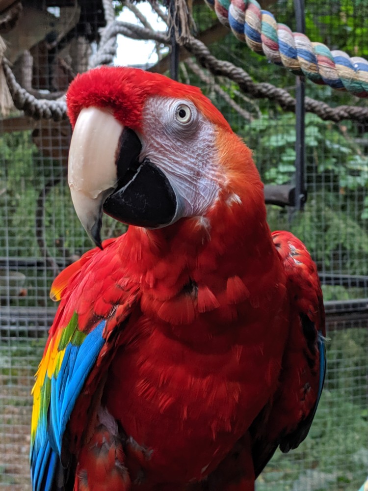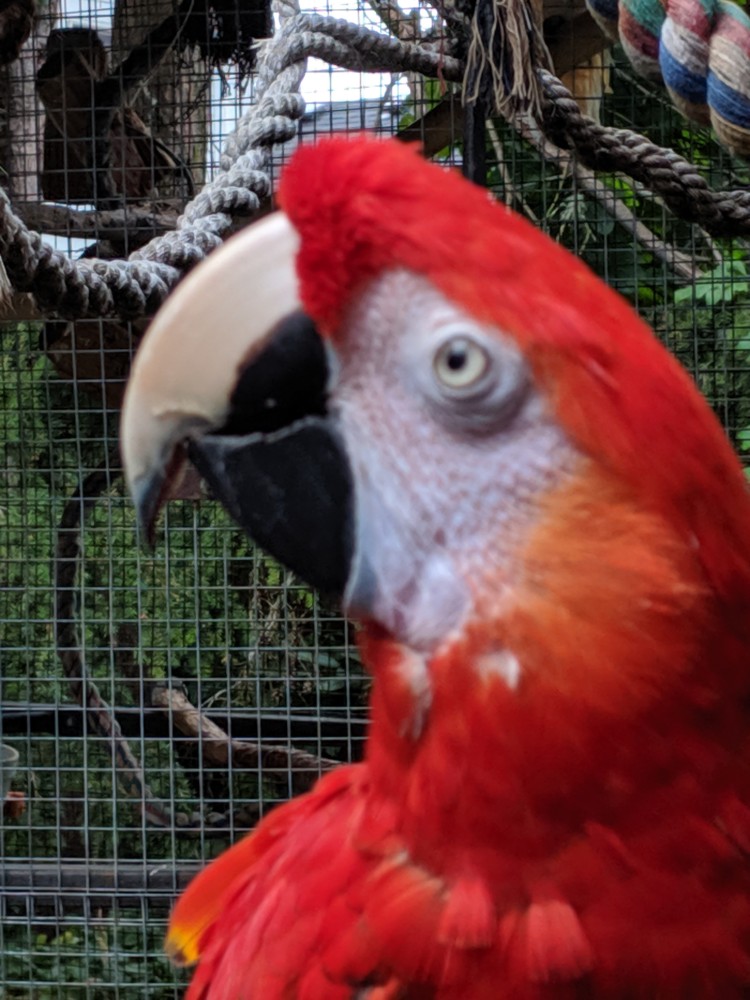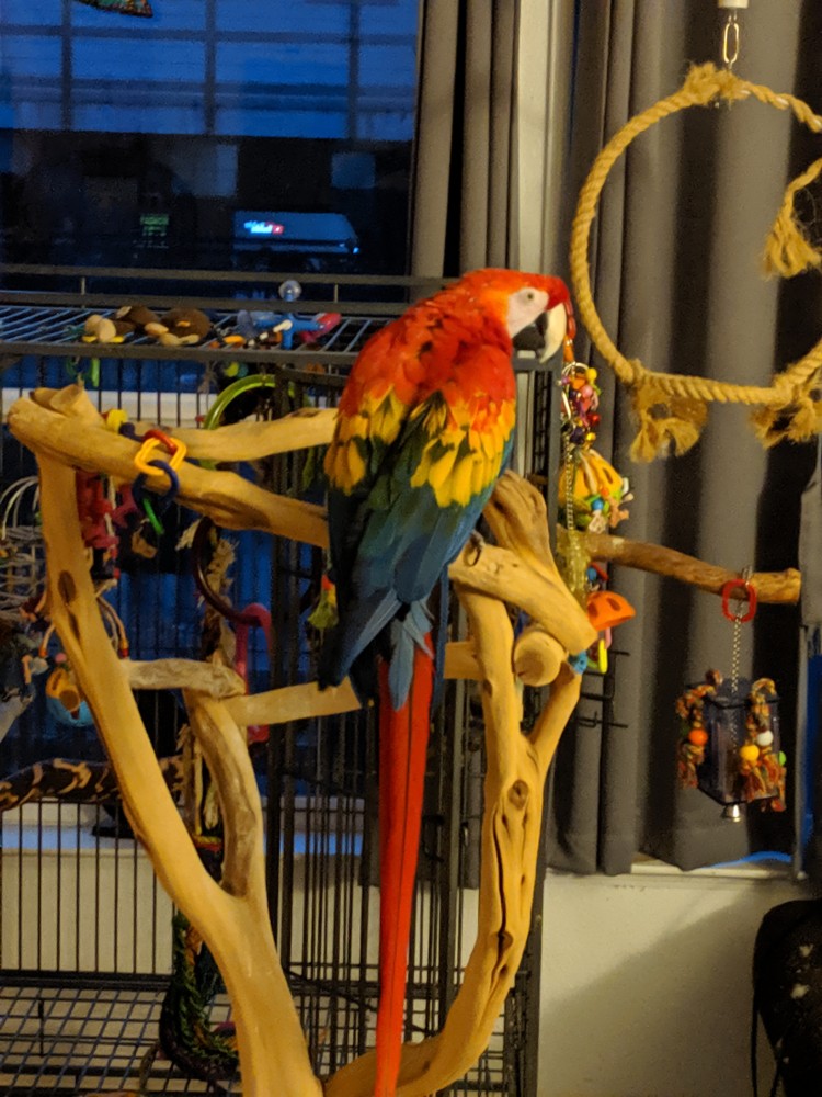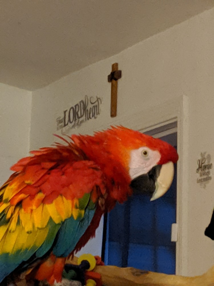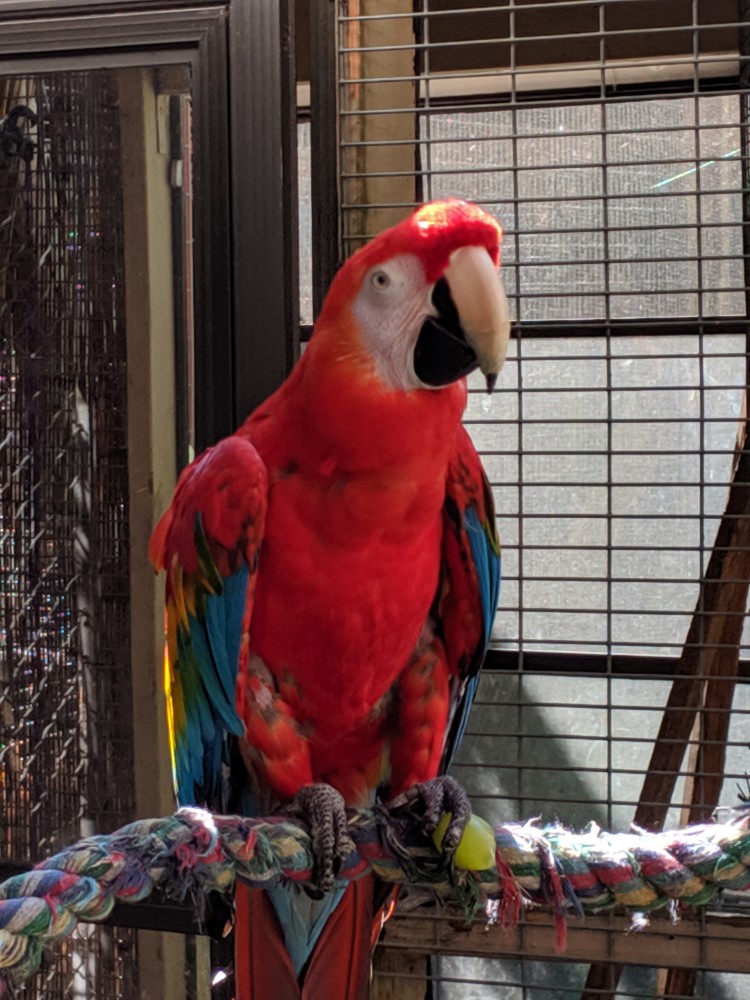 Shyanne’ is a wonderful hand tame 18 YO female Scarlet Macaw who loves to cuddle. Scarlet macaws are on the endangered species list, and Shyanne is dear to our hearts. So we will be selective on who adopts her. Shyanne’ loves to be cuddled, but she does Not play well with other macaws. We only re-home our Shyanne with a homeowner.