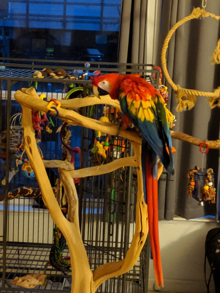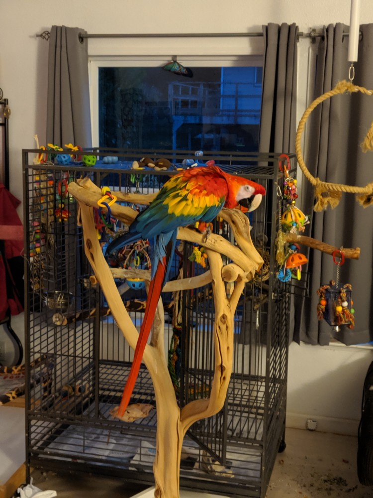 Shy’ is just a young 15 year old girl who likes to cuddle and interact with her flock. The one thing, Shy-Anne’ needs to live outside her cage, on the door or her Manzanita tree as much as possible. She is accustomed to a min of 6 hours a day. If you can’t offer this to her, please don’t apply to adopt her.