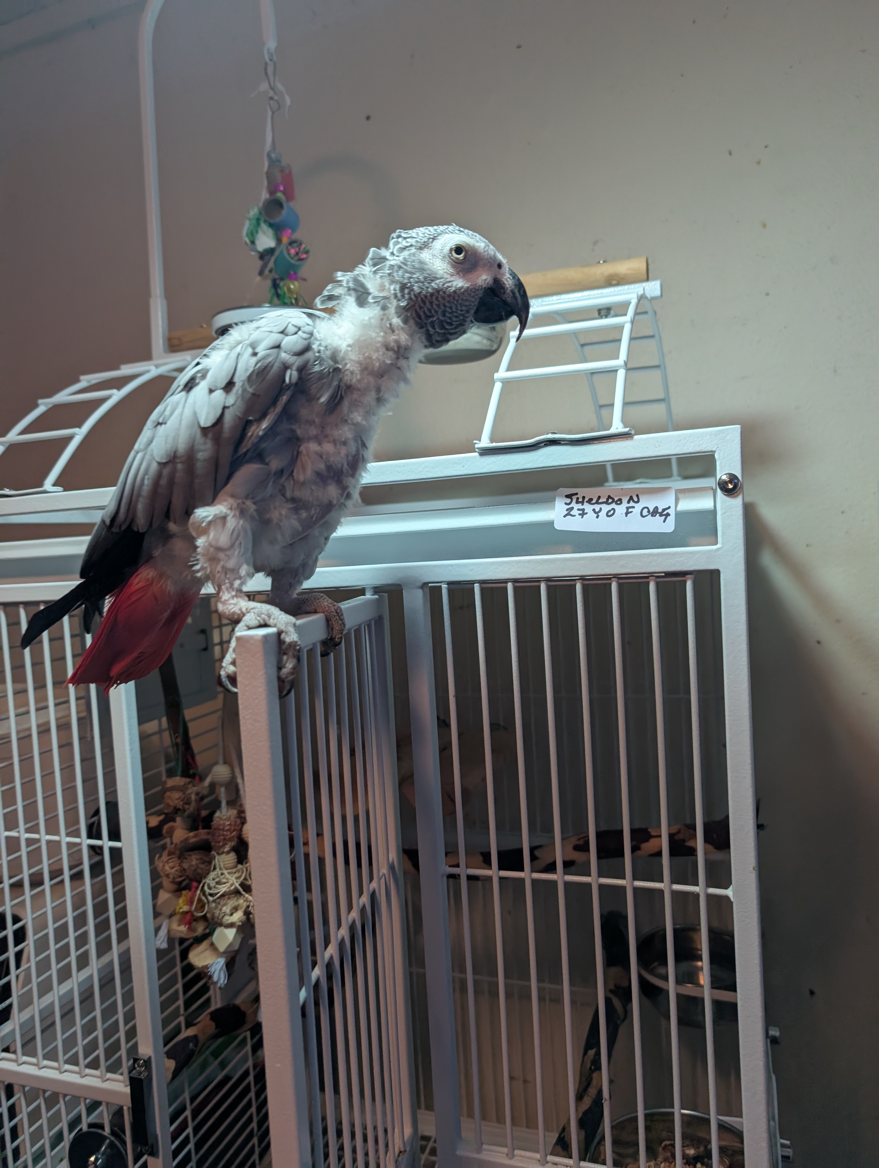 Their feathers are finally starting to grow back, and they are blossoming into the beautiful parrots they were meant to be. During the day, they play together in the same aviary, where they are lively and affectionate with each other. At night, they rest in their side-by-side cages.