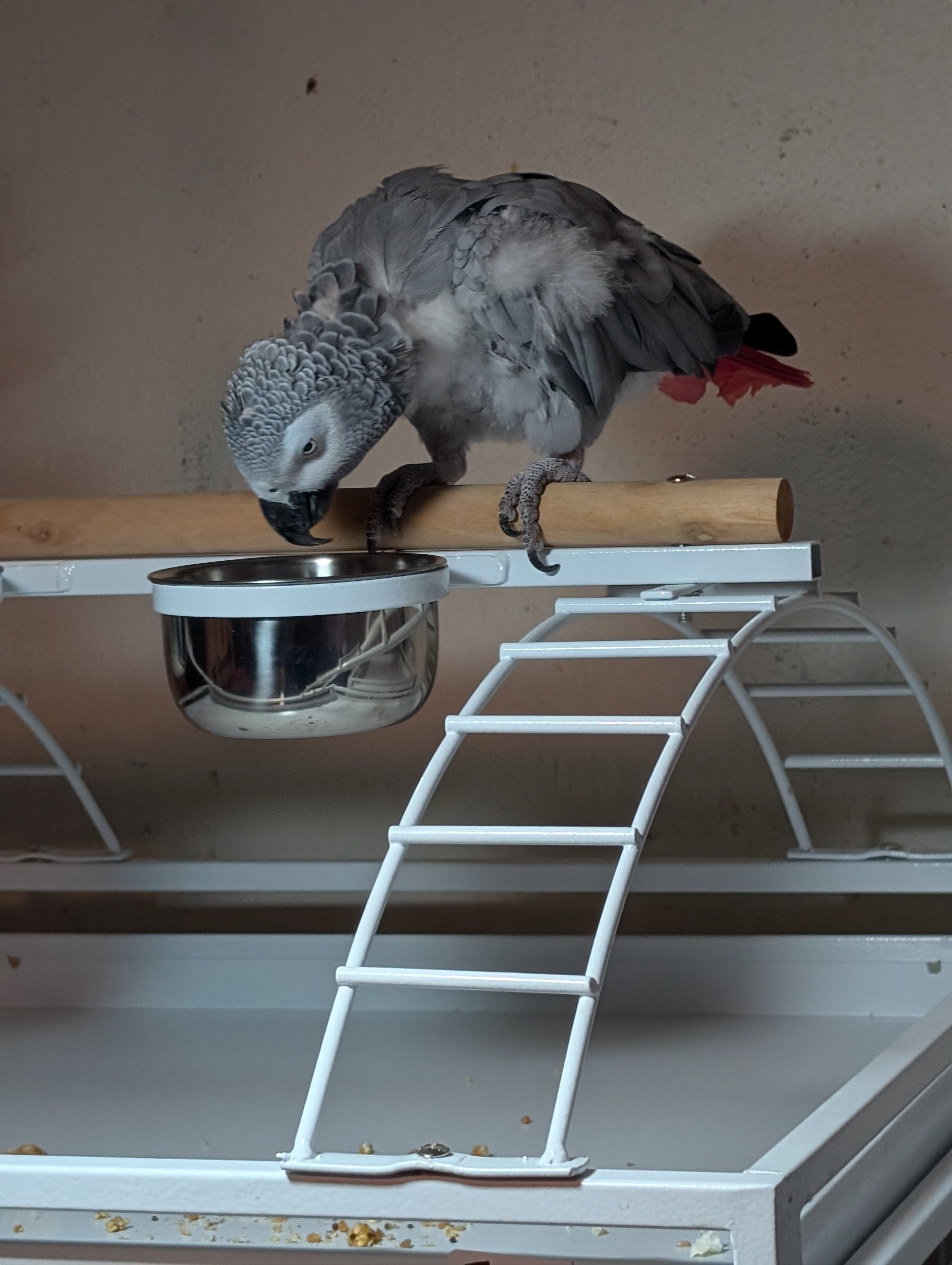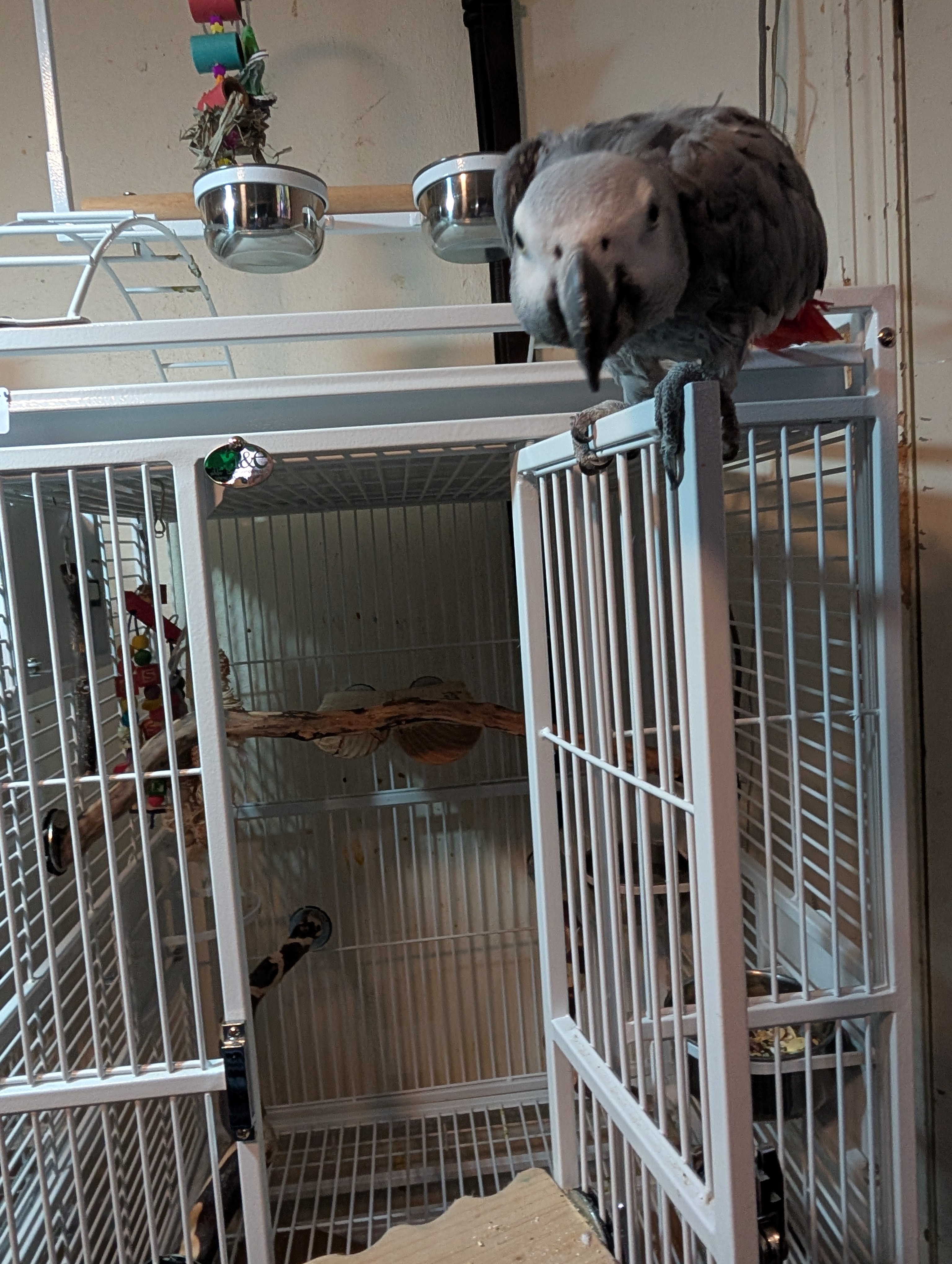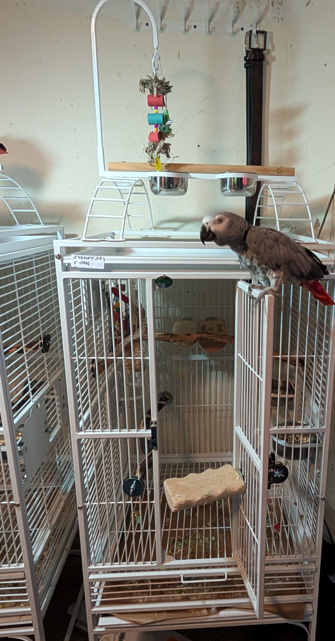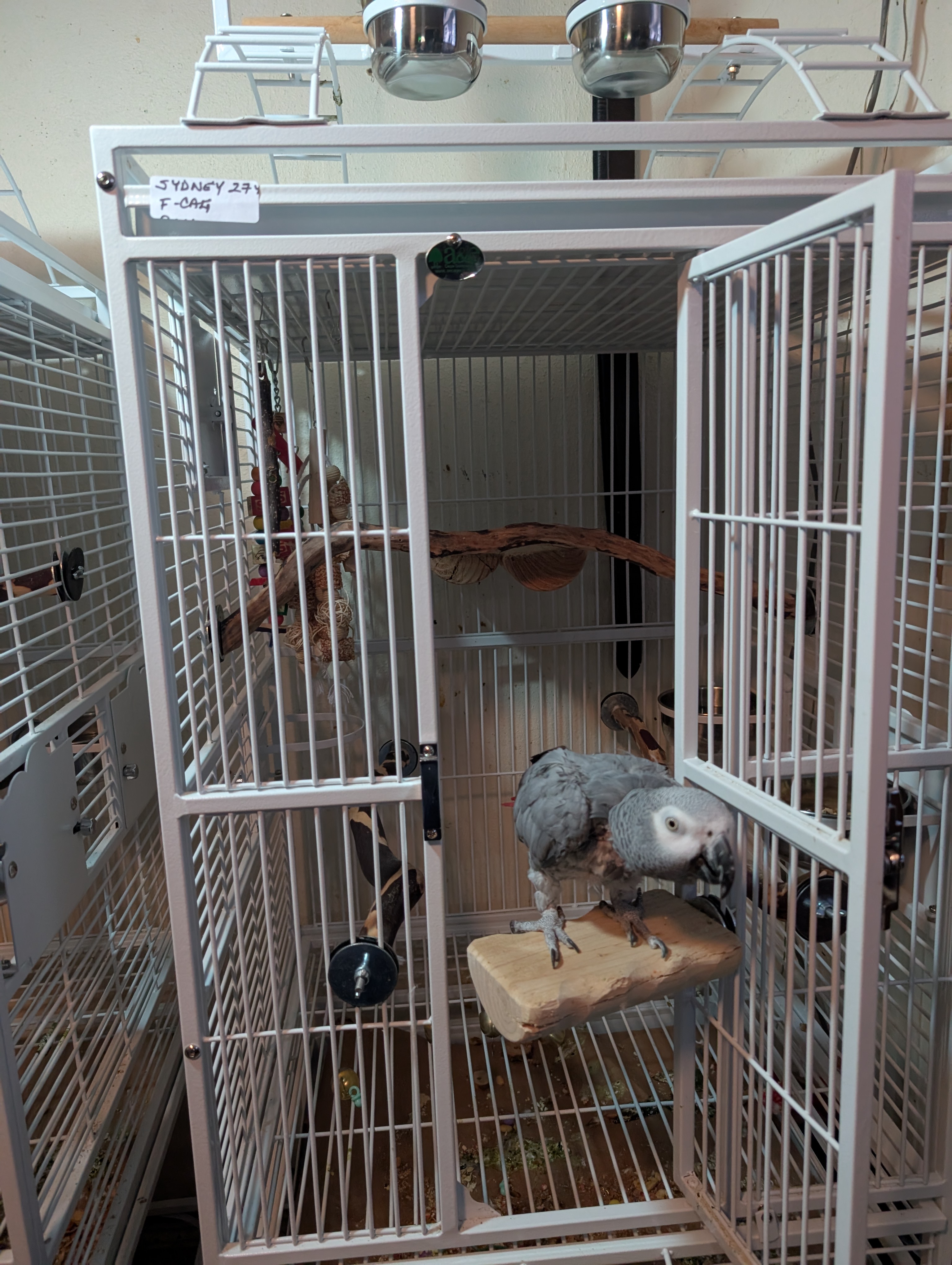 When they arrived, they were housed together in one medium-sized, overcrowded cage. They had been competing for food and treats, and even plucking each other’s feathers for years. Since being placed in their own brand-new, identical white cages (A&E Model #8002422), they have flourished. Often, they mirror each other’s actions. For example, when one eats, the other follows, proudly showing off her own food bowl.